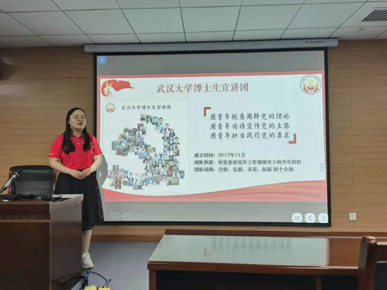 首先,黄丹阳同学为大家简单介绍了武汉大学博士生宣讲团的情况,阐述了“用青年视角阐释党的理论,用青年话语宣传党的主张,用青年担当践行党的要求”的核心理念,让支部的党员们对博士生宣讲团有了更加深刻的了解与认识。