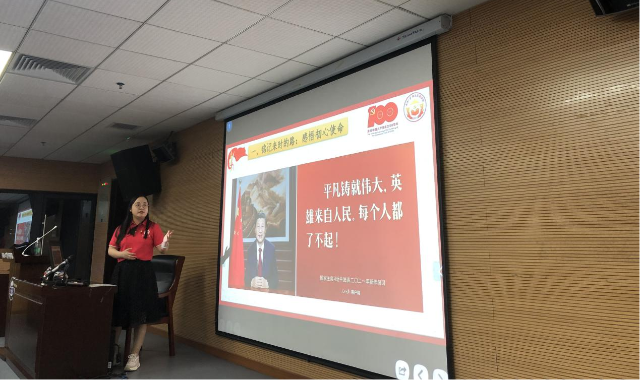 铭记来时的路:感悟初心使命。黄丹阳同学从建党这一开天辟地的大事开始说起,描绘了中国共产党在近现代时期筚路蓝缕的建设和发展历程,同时将党的初心使命和我校的历史结合起来,讲述了武汉大学老校长李达同志的故事,让在场的同学们听了之后深有感触。“平凡铸就伟大,英雄来自人民,每个人都了不起”,黄丹阳同学引用习近平总书记的话,阐明人民群众是历史的创造者这一观点,指出我们要铭记初心使命,不忘来时的路。