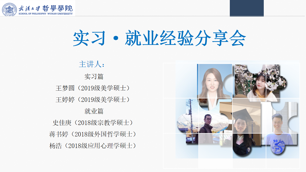 2021年6月17日下午15点,由必赢766net手机版研究生会主办的“实习·就业经验分享会”在必赢766net手机版B107顺利举行。本次经验分享会由2020级硕士研究生修风翊主持,内容分为实习和就业两个篇章,分别邀请到了2019级美学硕士研究生王梦圆以及王婷婷分享实习经验,2018级宗教学硕士研究生史佳庚、2018级外国哲学硕士研究生蒋书婷、2018级应用心理学硕士研究生杨浩分享就业经验。研究生兼职辅导员杜金玉出席了此次活动。