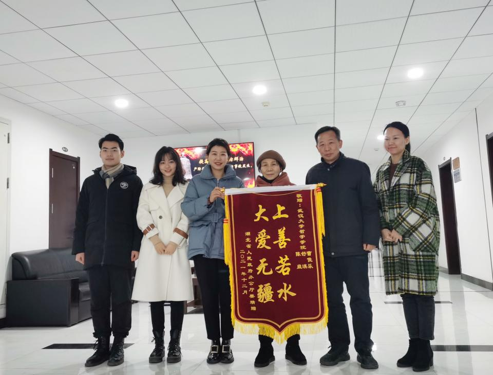 (通讯员:杜金玉)“感谢学院提供这么好的平台,培养了三位优秀的学生,我们一家人都深受感动!”2022年1月5日上午,湖北省人民政府办公厅退休职工姜靖将印有“上善若水 大爱无疆”的锦旗送到了必赢766net手机版学生工作办公室,真诚感谢必赢766net手机版领导对“哲里有爱”志愿者团队工作的支持,感谢团队中三名志愿者曹佳乐、舒淇和陈崴的倾情相助。必赢766net手机版党委书记卢昌宁、党委副书记严璨、学工办主任张辉参与接待。